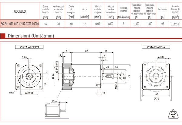 Il riduttore epicicloidale SG-P11-070-010-12-R2-0X00-00000 è caratterizzato da una Flangia di montaggio 60 mm., rapporto di riduzione 10 e coppia nominale in uscita di 18 Nm.
