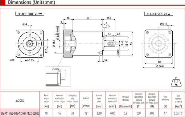 Il riduttore epicicloidale SG-P11-050-003-12-HH-712X-00000 è caratterizzato da una Flangia di montaggio 60 mm., rapporto di riduzione 03 e coppia nominale in uscita di 10 Nm.